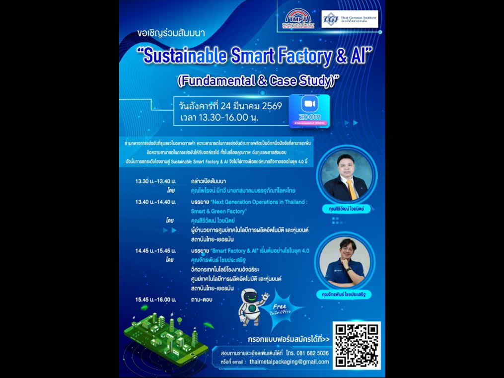 Thai Metal Packaging Association (TMPA) together with Thai-German Institute (TGI) under Ministry of Industry (MOI) set up webinar Sustainable Smart Factory & AI” (Fundamental & Case study) on March 24,2026.